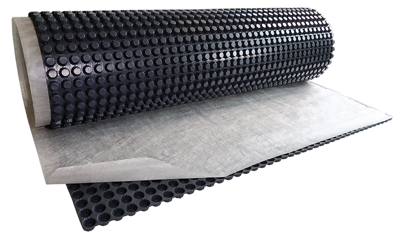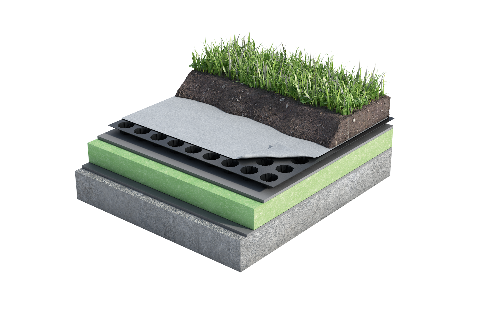 The plant substrate can be applied directly as the geotextile is already integrated. This saves an additional work step. Thanks to the perforation, the water-storing drainage membrane is permeable and can also be used for inverted roofs. This prevents a film of water from forming on the inverted roof insulation. The geotextile should be removed from walkable areas without vegetation. The base layer and the bedding material can then be applied directly on the dimpled membrane without changing the material, and then the pavement or slab covering can be laid on top of it.